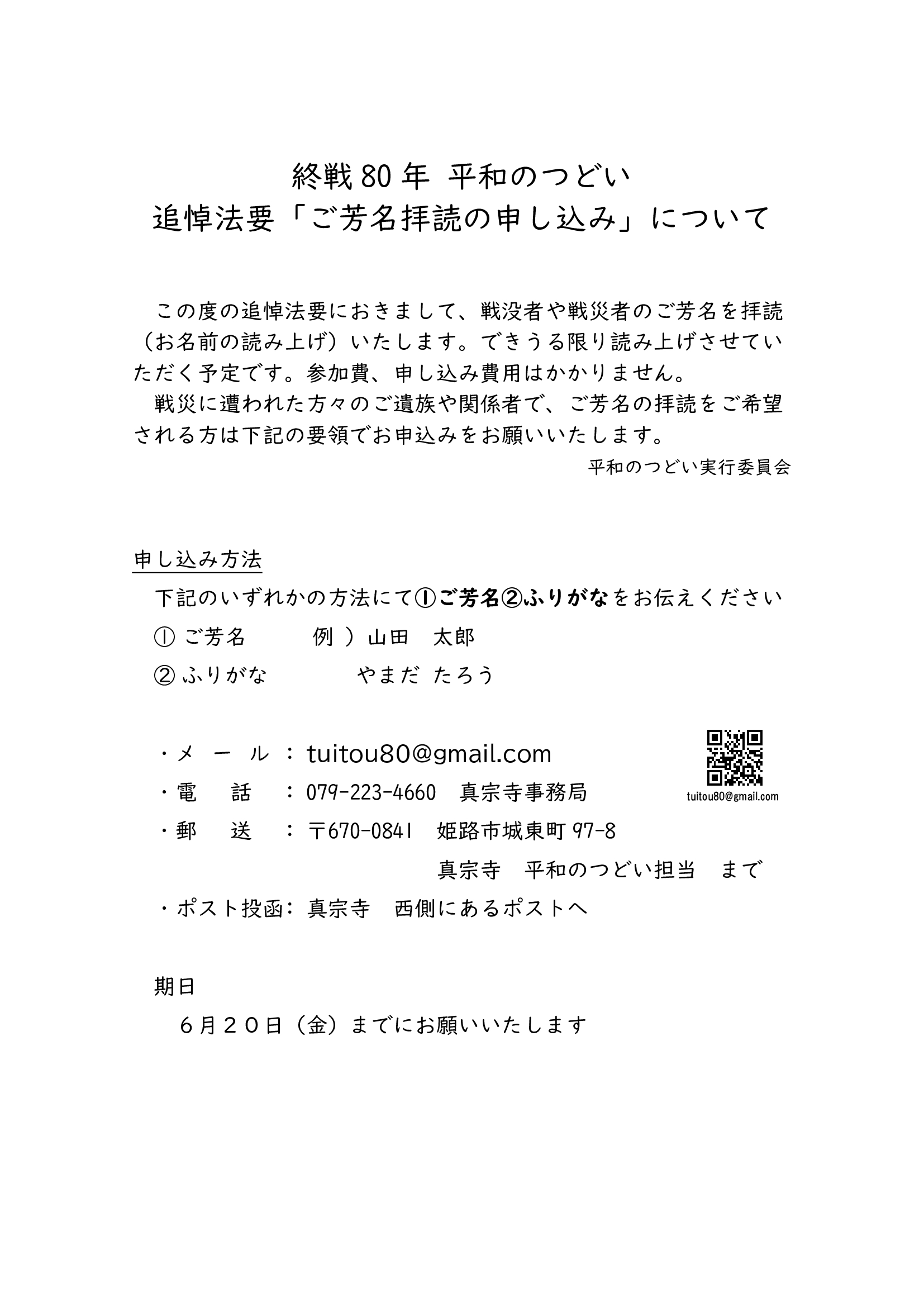 ここに終戦80年平和のつどいとして、戦没者並びに被災者のご遺族、関係者にご案内して追悼法要を勤修いたします。戦災に遭われた方のご芳名拝読をご希望の方はお申し込みをお願いいたします。